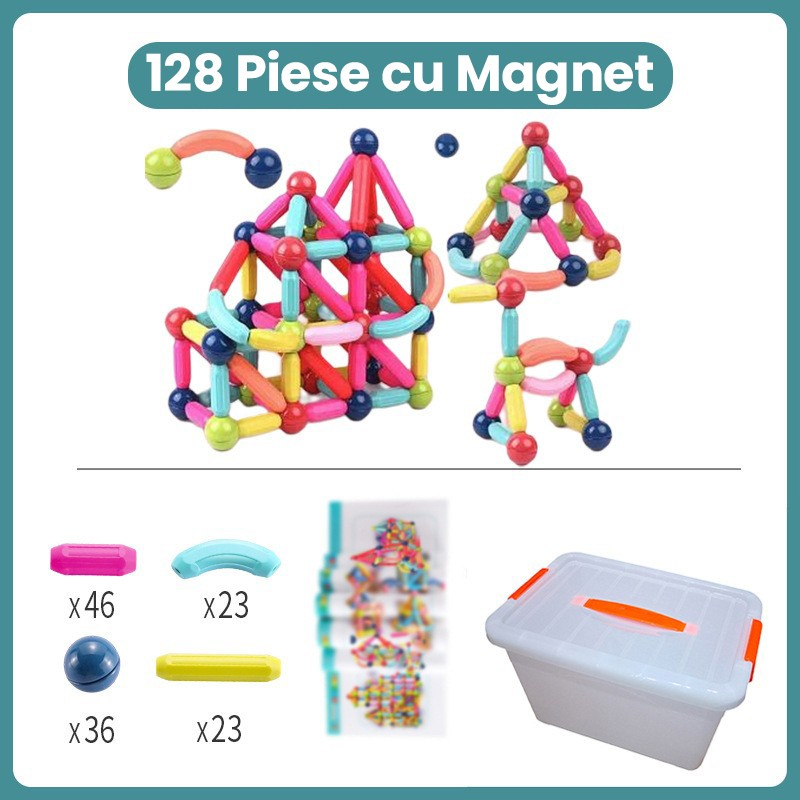 Piesele sunt realizate din materiale rezistente si sigure pentru copii, avand magneti integrati care asigura o fixare stabila. Copiii pot crea constructii variate, precum turnuri, casute, forme geometrice sau structuri abstracte, dezvoltandu-si coordonarea mana-ochi si creativitatea.