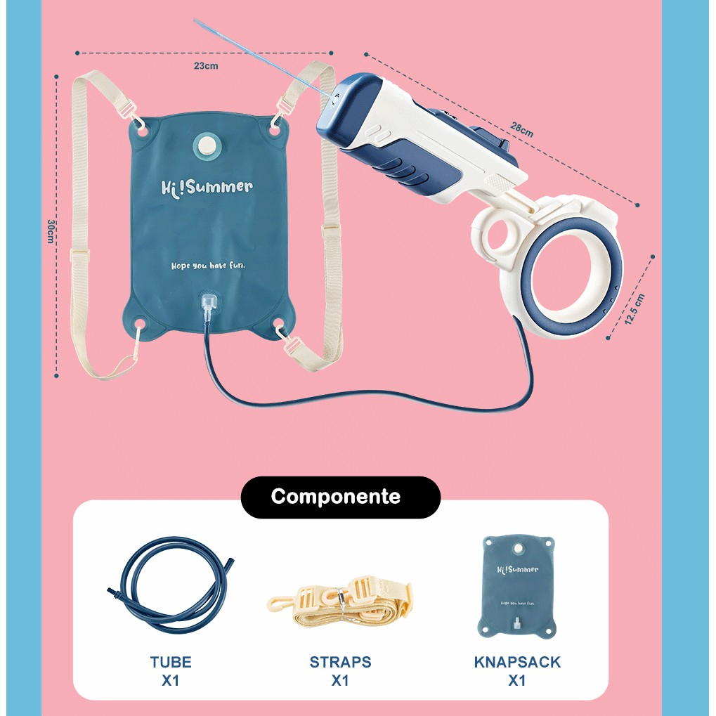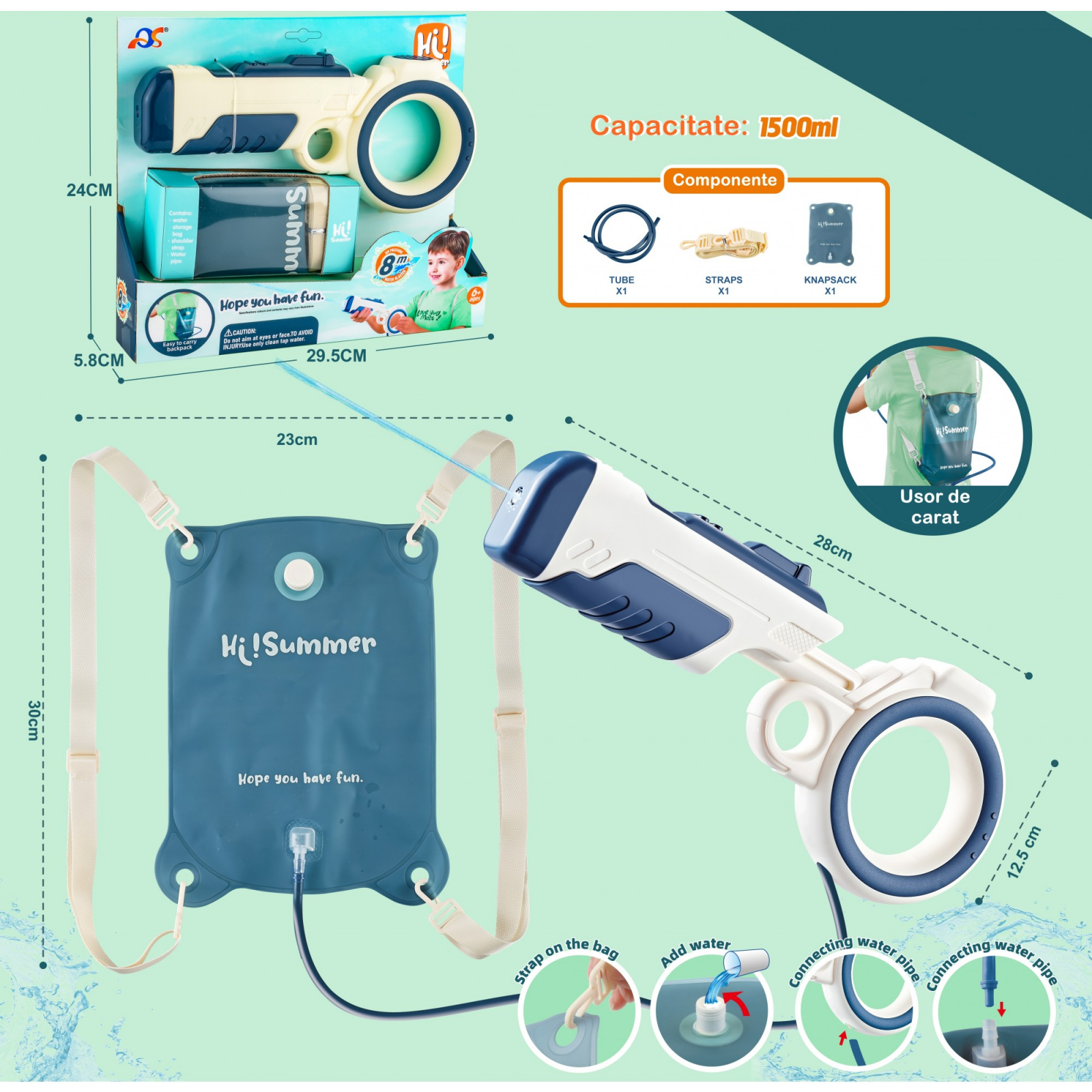 Rezervor generos de apă: Cu un rezervor tip ghiozdan de 1500 ml, acest pistol cu apă permite copiilor să se bucure de distracție fără a fi nevoie să umple adesea rezervorul. Astfel, vor putea petrece mai mult timp jucându-se și improscând apă.
