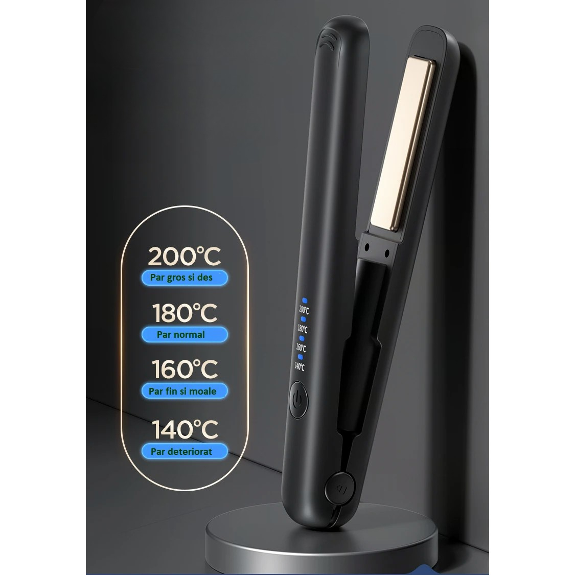 Interval de Temperatură: 140℃ - 200℃, reglabil în 4 trepte pentru diferite tipuri de păr și stiluri.