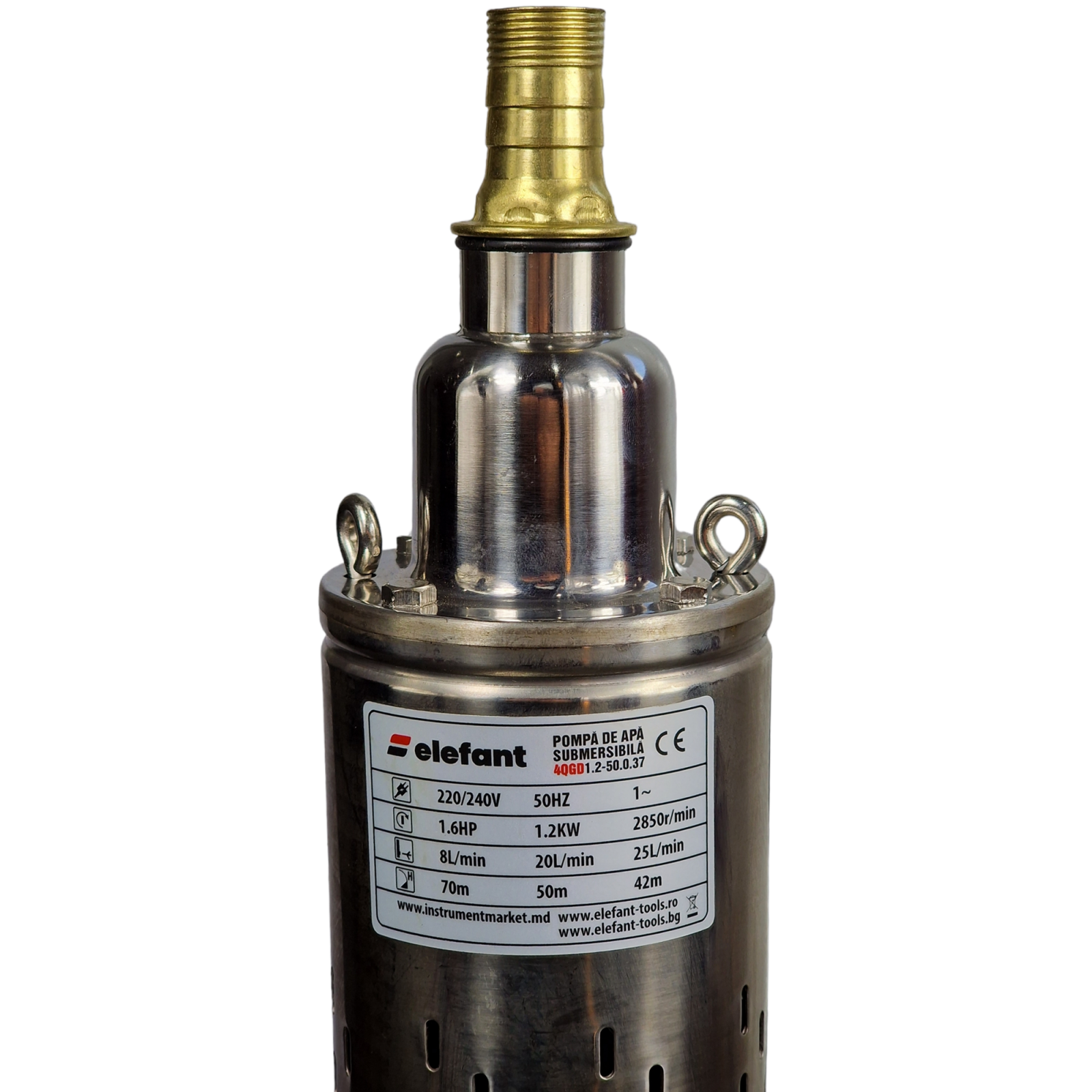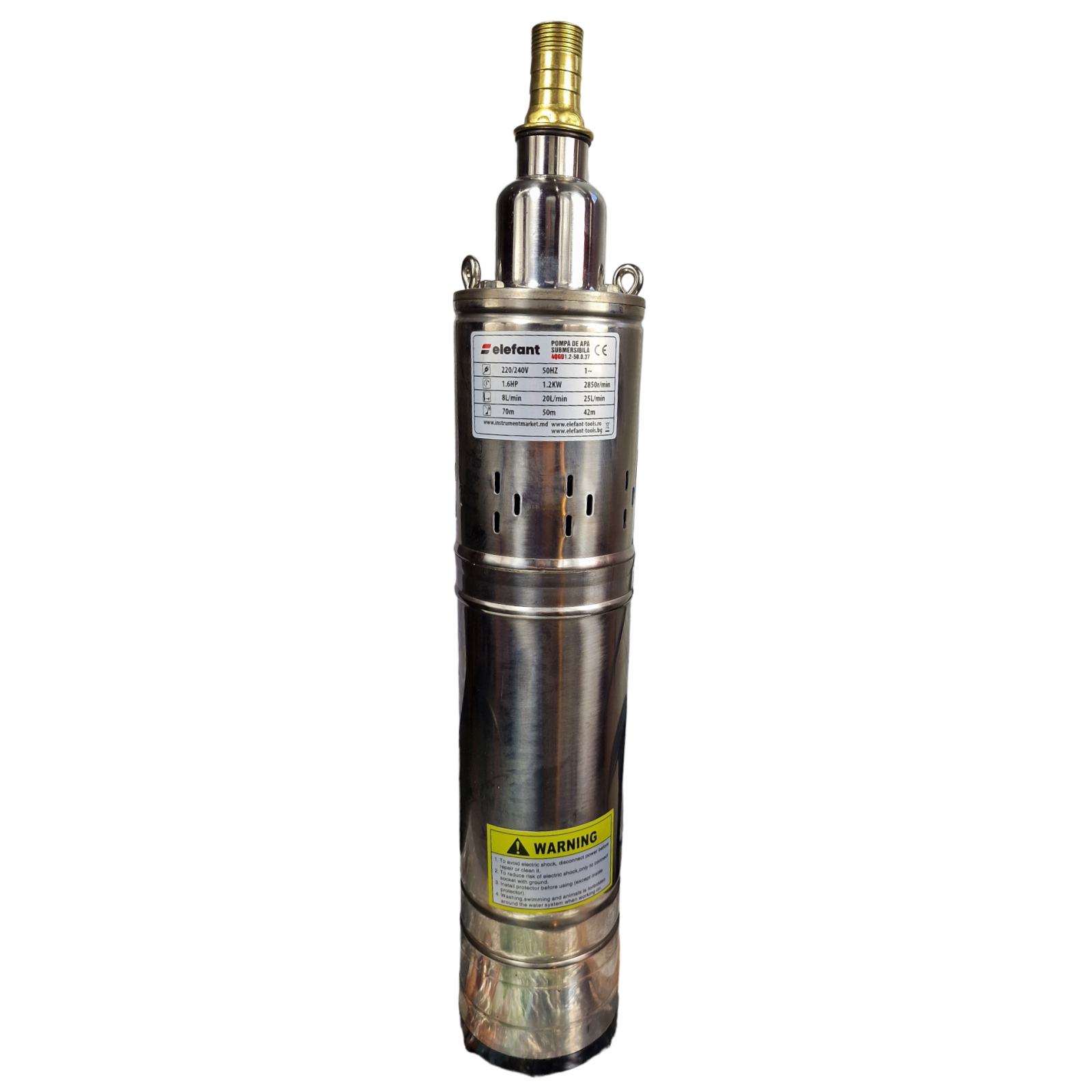 Pompa ELEFANT 4QGD1.2 50 0.37Pompa este folosita pentru extragerea apei curate din fantani, rezervoare sau alte surse de apa curata.Este utila in gospodarii, gradini pentru irigat, dar si pomparea apei in instalatiile sanitare.Este un echipament electric usor de utilizat,sigilat ermetic,cu ajutorul careia apa va iesi la suprafata fara efort.Specificatii tehnice: Putere: 370 W Tensiune: 220V Debit maxim: 30/min Inaltime maxima: 70m Adancime maxima: 40m Greutate: 10 kg