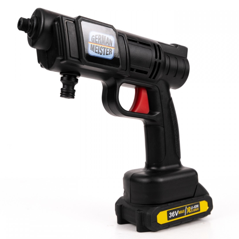 În kitul de bază este inclus un dispozitiv de curățare care este echipat cu 2 duze multifuncțională o extensie, cablu de incarcare acumulator cu conectare auto, un bidon pentru solutie de spalat, acumulator 36v si o duza conectare furtun. Presiunea de operare poate fi reglată, astfel încât să fie posibilă atât curățarea ușoară, cât și cea puternică. Un furtun de aspirație trage lichid din orice sursă fie că este găleată, lac sau robinet.