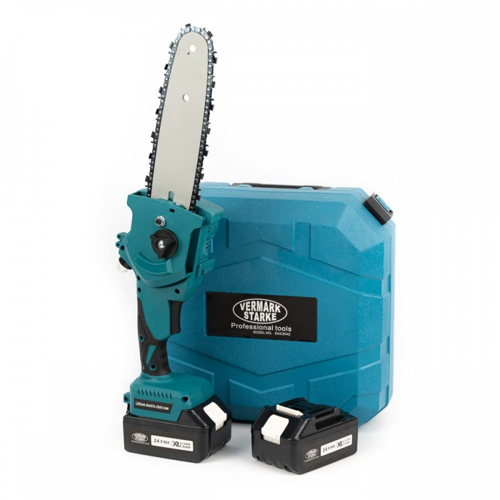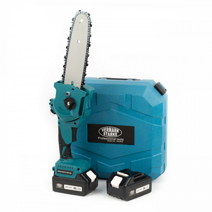 Minifierastrau cu 2 acumulatori Vermark Starke 24 V, 6 Ah. 20cm lama are sistem de ungere al lantului