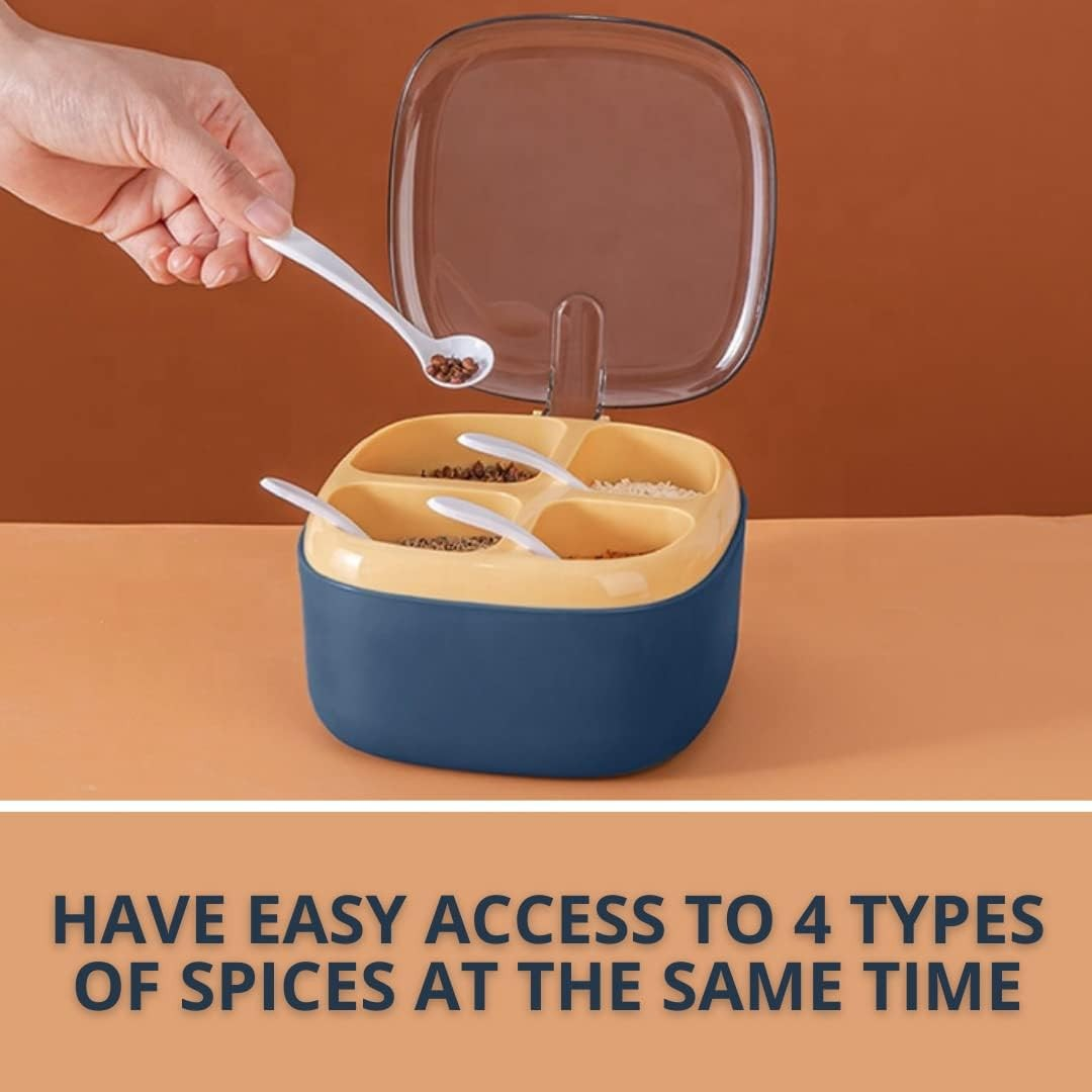 Organizare eficientă: Acest recipient dispune de 4 casuțe separate, care permit depozitarea și organizarea condimentelor, precum sare, cimbru, piper și alte condimente preferate. Astfel, vei putea găsi rapid condimentele dorite și vei evita amestecarea lor.