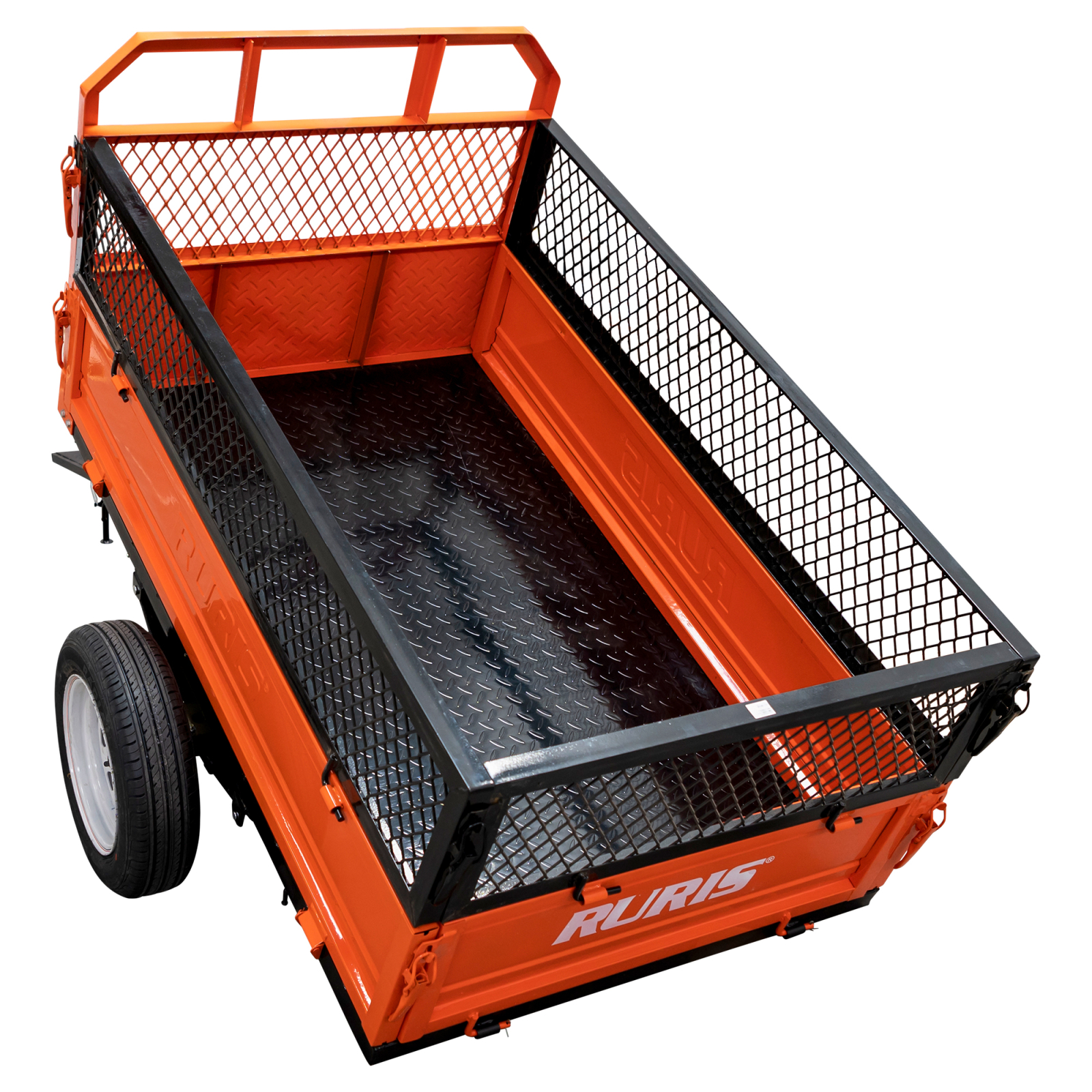 Remorca RURIS 750SA pentru motosapele RURIS, are 160 cm lungime, 100 cm latime, 750 kg capacitate maxima de incarcare, deschidere obloane 90A°, basculare manuala, sistem de franare prin saboti cu ferodou, mod de franare mecanic cu medala, suspensie pe arc lamerlar._x000D_
