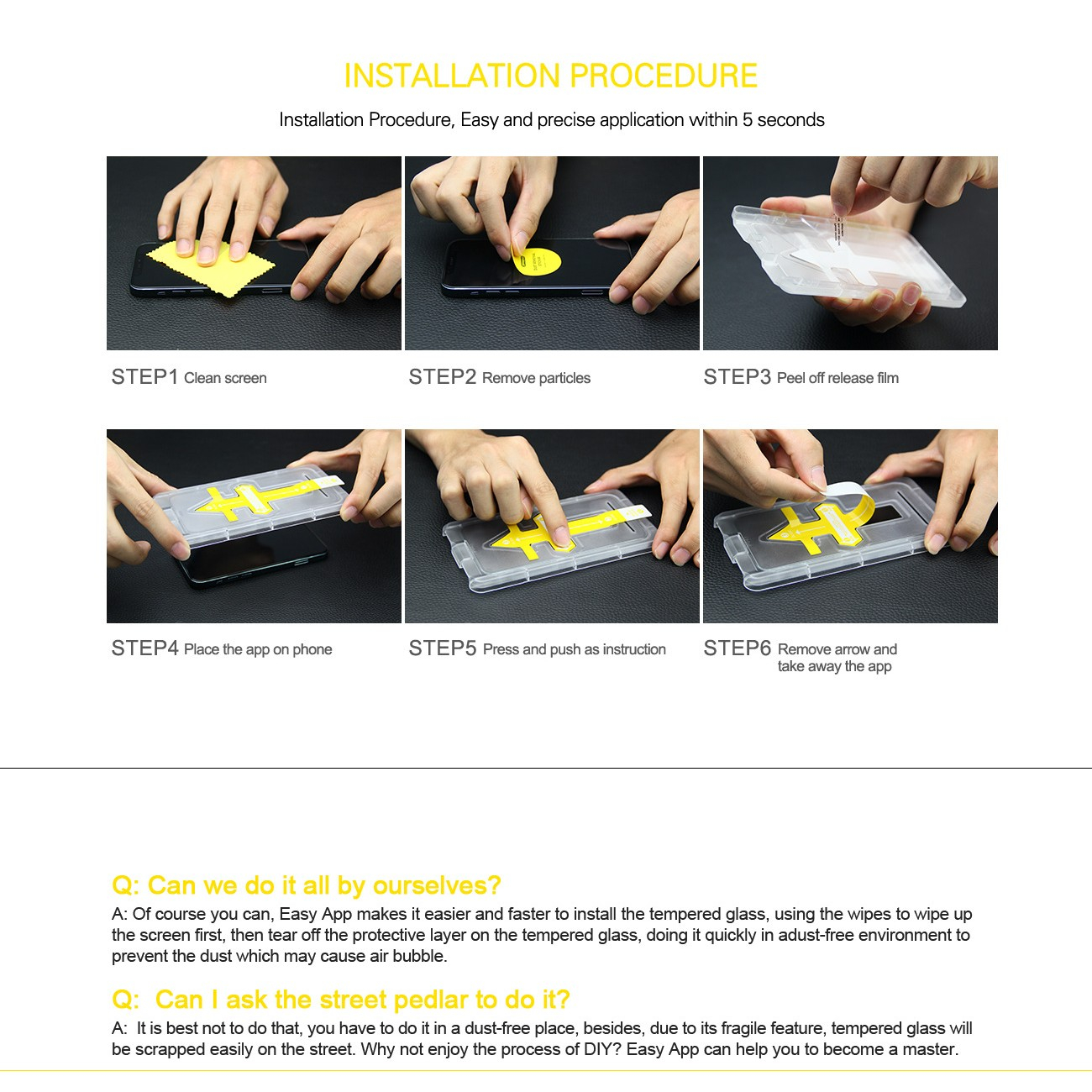 KIT DE INSTALARE USOARA PENTRU ALINIERE PERFECTA - Aplicatorul pentru instalare automata si simplu face ca alinierea perfecta sa fie o joaca de copii. Da, se monteaza extrem de rapid datorita aplicatorului Easy App special creat pentru Apple iPhone 13 Pro Max. Kitul include: 2 x Folii din sticla, 1 x Cadru aplicator Easy App, 2 x Servetele de curatare, 2 x Servetele din microfibra si 2 x Benzi adezive pentru indepartarea prafului. Practic tot ce ai nevoie pentru a va monta singuri aceaste super folii din sticla. Aplicatorul special conceput poate fi transformat in suport de birou pentru telefon.