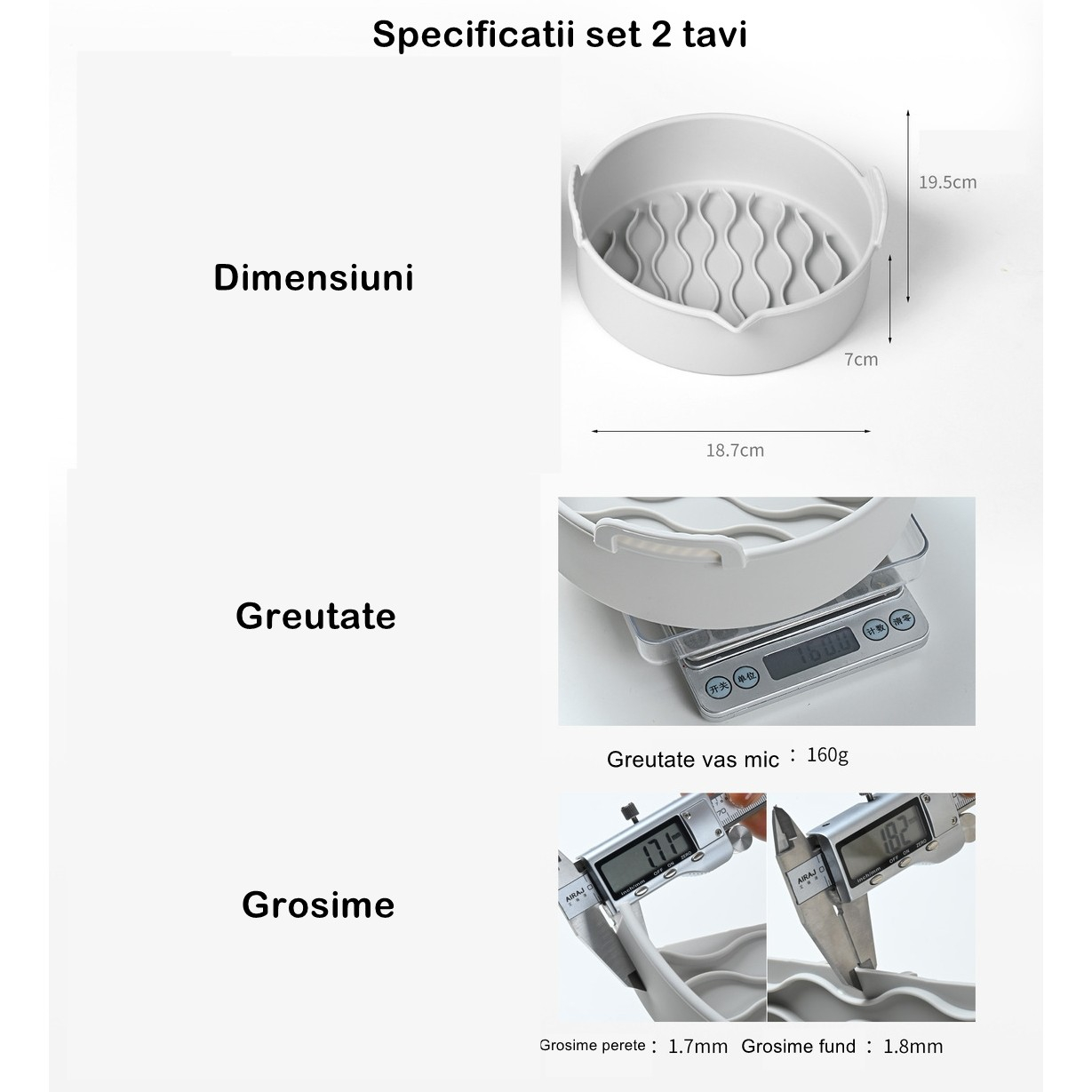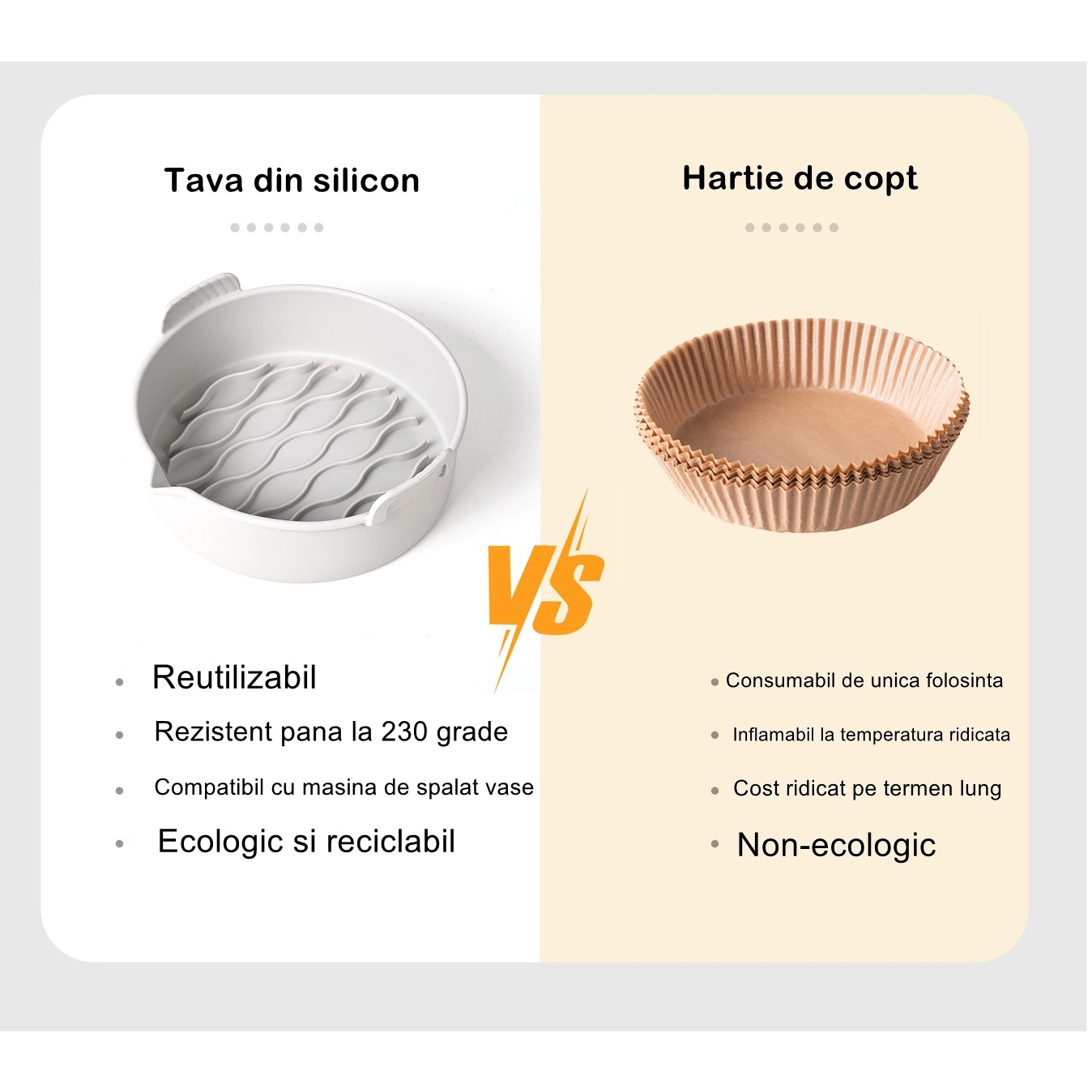 Temperatură ridicată și rezistență: Tăvile din silicon pot rezista la temperaturi de până la 230 de grade Celsius, ceea ce le face potrivite pentru diverse preparate gătite la cuptor sau în air fryer. Această rezistență le face să fie un instrument versatil și durabil în bucătărie.