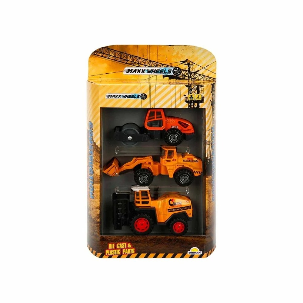 Setul contine 3 modele diferite de vehicule din metal: camion, basculanta, mixer, masina de asfaltat, betoniera, buldozer, excavator si tractor.