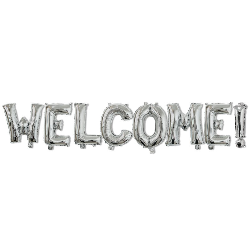 Set Baloane din Folie Metalizata, Flippy, Model WELCOME!, Litere de 40 cm, Baloane Party, Ambalaj Individual, Pai Inclus, Umflare cu Aer sau Heliu, Argintiu