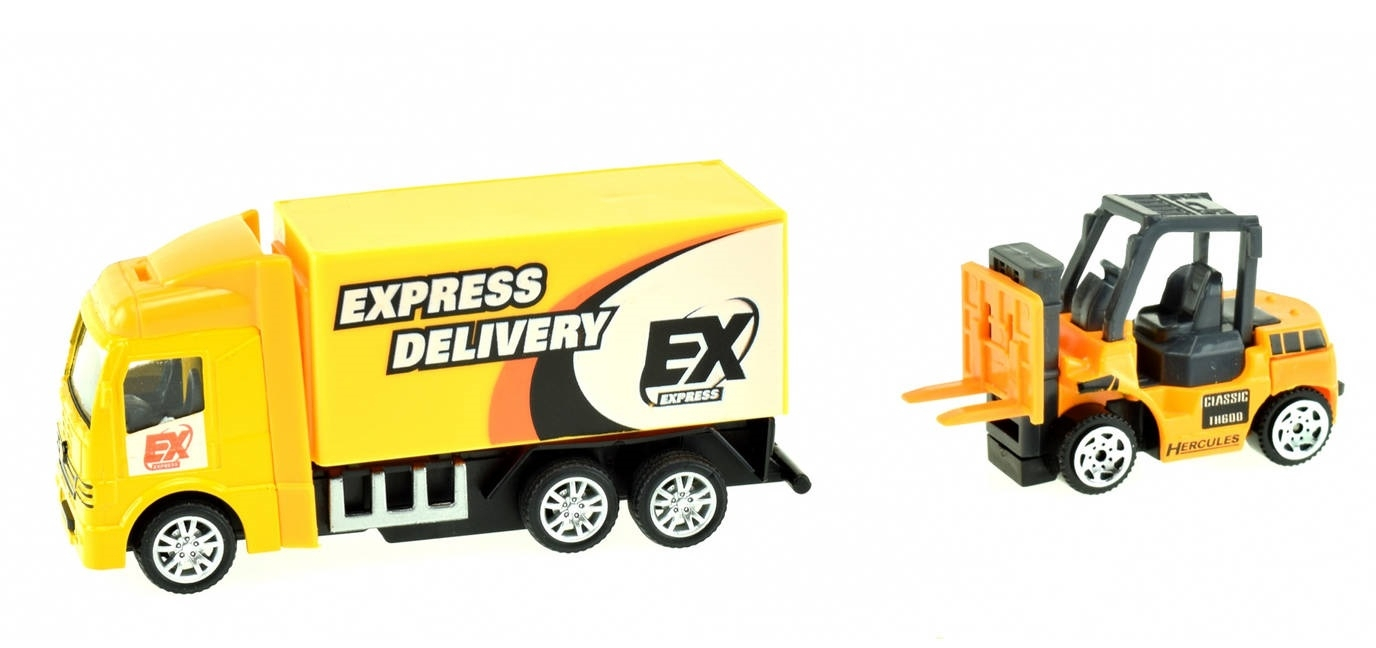 Super setul metalic pe roti ofera micutilor un mod unic de a-si petrece timpul. Jucaria se misca inainte-inapoi. Camionul si stivuitorul ii va captiva imediat pe cei mici!