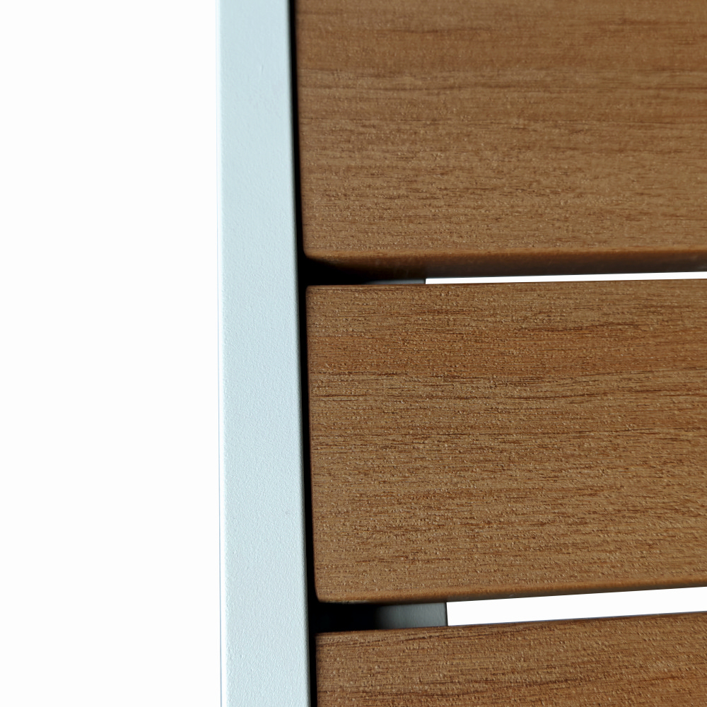 Culoare: gri; Material: aluminiu / lemn; Tip masa: fixa; Tip scaun: fix; Sezut cu burete: da; Greutate (kg): 55; Rezistenta la umezeala: da; Rezistenta la uv: da; Dimensiuni masa (cm): 65 x 65 x 40; Dimensiuni scaun (cm): 135 x 70 x 63;