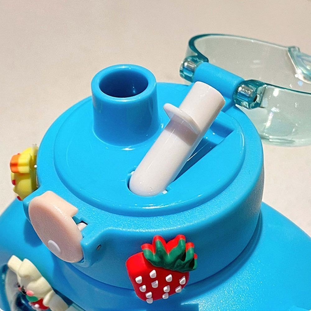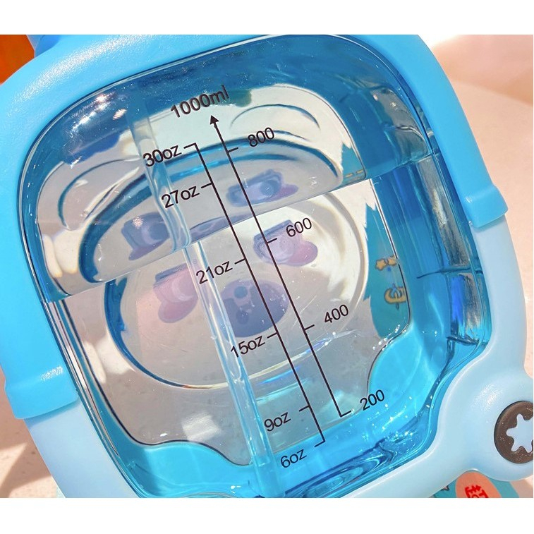 Sticla cu pai pentru copii, Flippy, model ursulet, gradata, stickere aplicate, curea reglabila, din plastic rezistent la cadere, 1l, Albastru, 20 x 13 cm