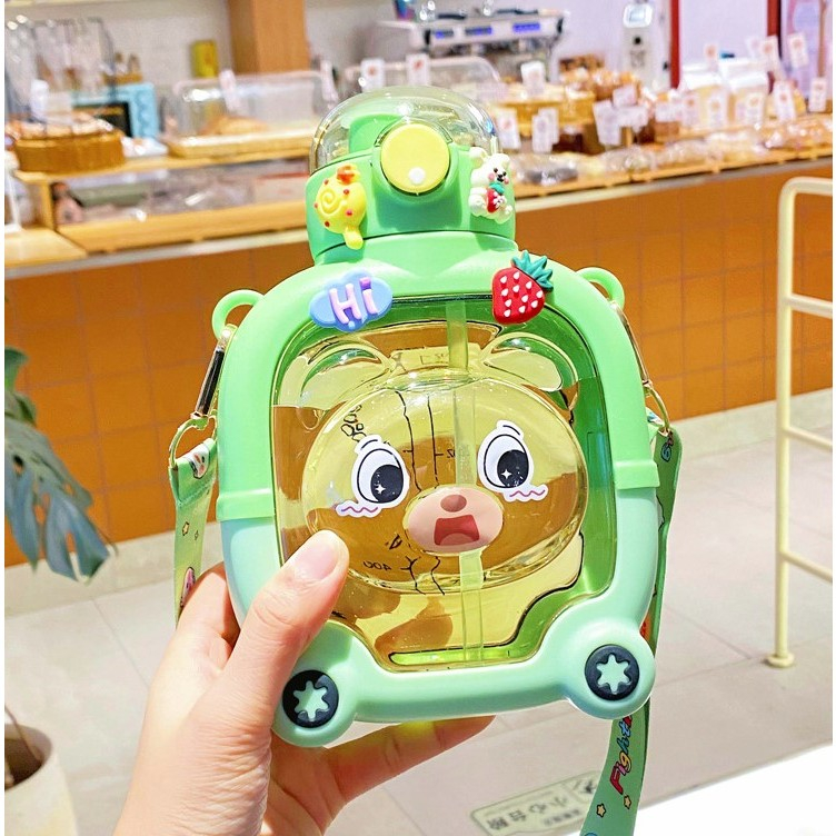 Sticla cu pai pentru copii, Flippy, model ursulet, gradata, stickere aplicate, curea reglabila, din plastic rezistent la cadere, 1l, Verde, 20 x 13 cm