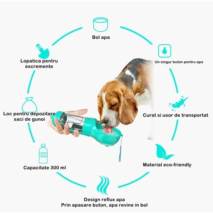 Versatilitate și economie de spațiu: Cu funcția sa 4 în 1, această sticlă reușește să ofere multiple utilizări într-un singur produs compact. Fie că este vorba de a asigura apă proaspătă și hrănitoare, de a stoca pungi igienice pentru curățarea rapidă sau de a avea o lopetiță pentru a menține curățenia în timpul plimbărilor, toate aceste funcționalități sunt integrate într-un design practic. Astfel, proprietarii economisesc spațiu și evită nevoia de a transporta mai multe obiecte separate atunci când pleacă cu animalul de companie.