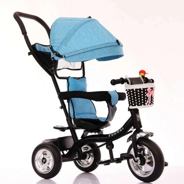 Tricicleta cu manere non alunecare, sa si vopsea eco, husa sa si spatar, cadru protectie, pedale non alunecare, roti spuma EVA, dubla pozitionare scaun copil.