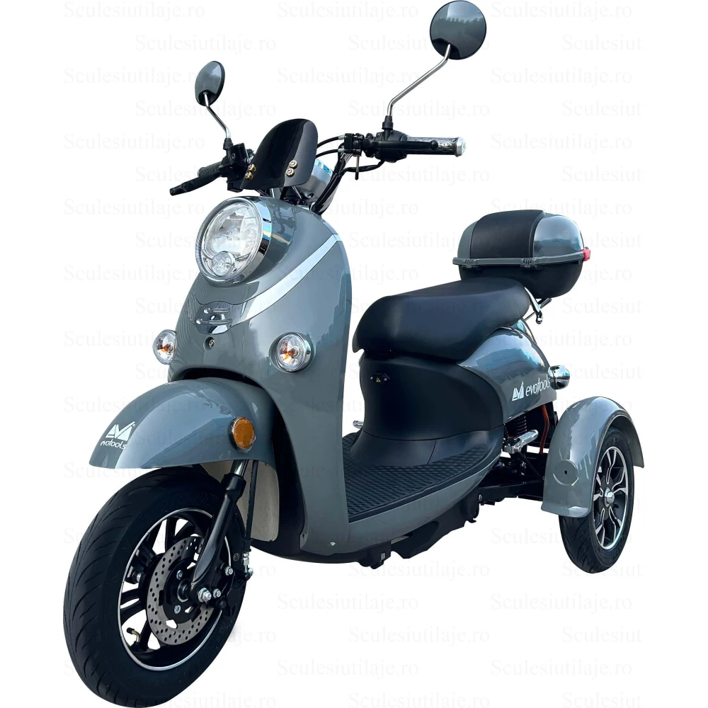 Triciclul electric pentru persoane TRP800 EvoTools vine echipat cu un motor brushless cu o putere de 800 W si poate atinge o viteza maxima de 25km/h. Datorita acumulatorului cu care este echipat acest vehicul, 60 V/20Ah (5 baterii x12V), este potrivit atat pentru oras cat si pentru plimbari in afara lui, avand o autonomie de aproximativ 50 km ( in conditii optime). Timpul de incarcare al baterii este de 6-8 ore. Vehicul este echipat cu o instalatie de iluminare care permite deplasarea pe distante scurte chiar si pe timpul noptii.