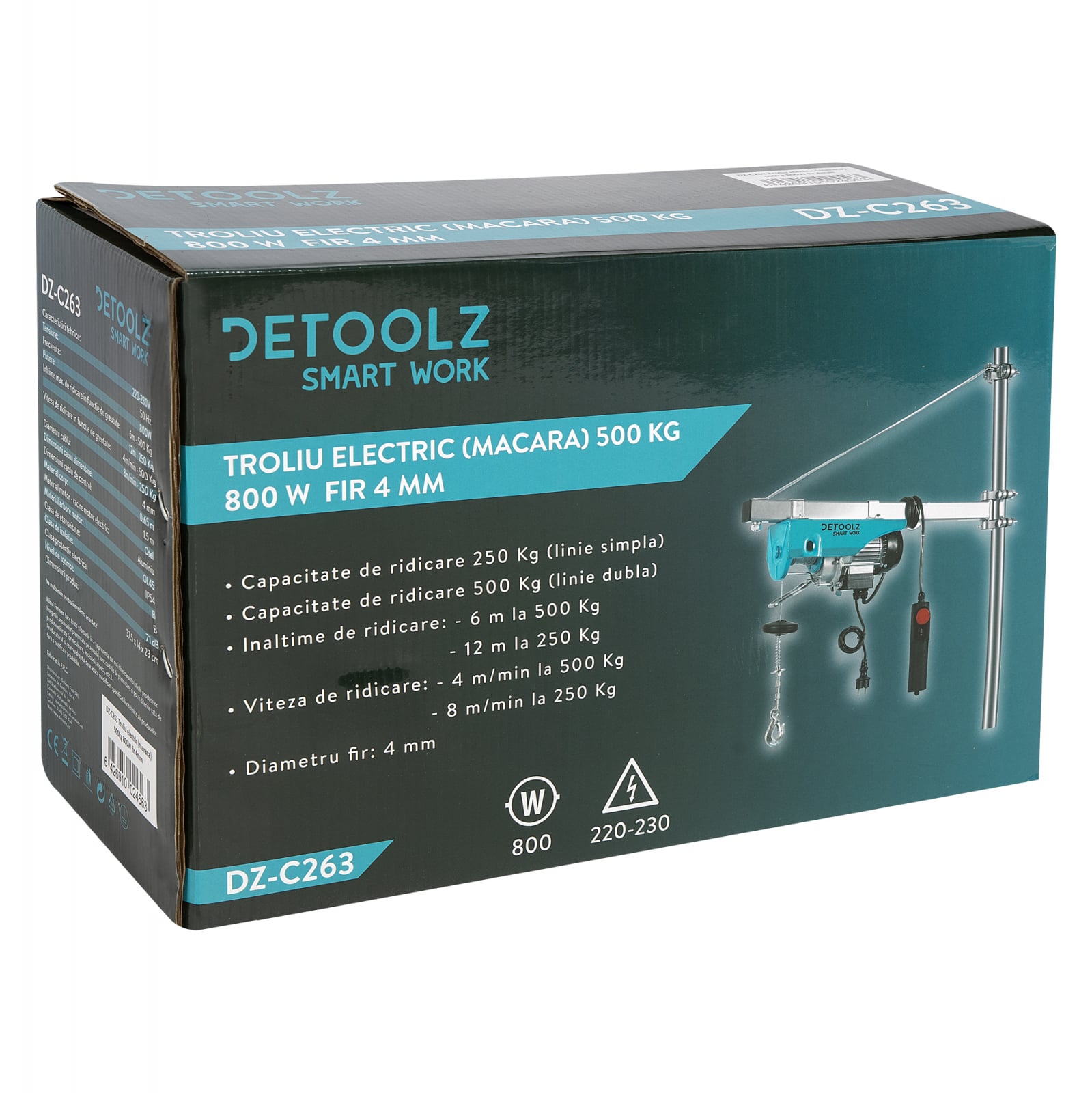 • Troliul electric Detoolz DZ-C262 are o putere de 450W, o capacitate de ridicare de 125 kg (linie simpla) si o capacitate de ridicare de 250 kg (linie dubla);