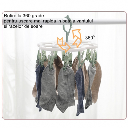 Uscator de Rufe Suspendat Flippy, cu 16 Carlige, Rotire 360 Grade, Mateiral Plastic, Usor de Depozitat, Multifunctional, 26 x 21 cm, Verde